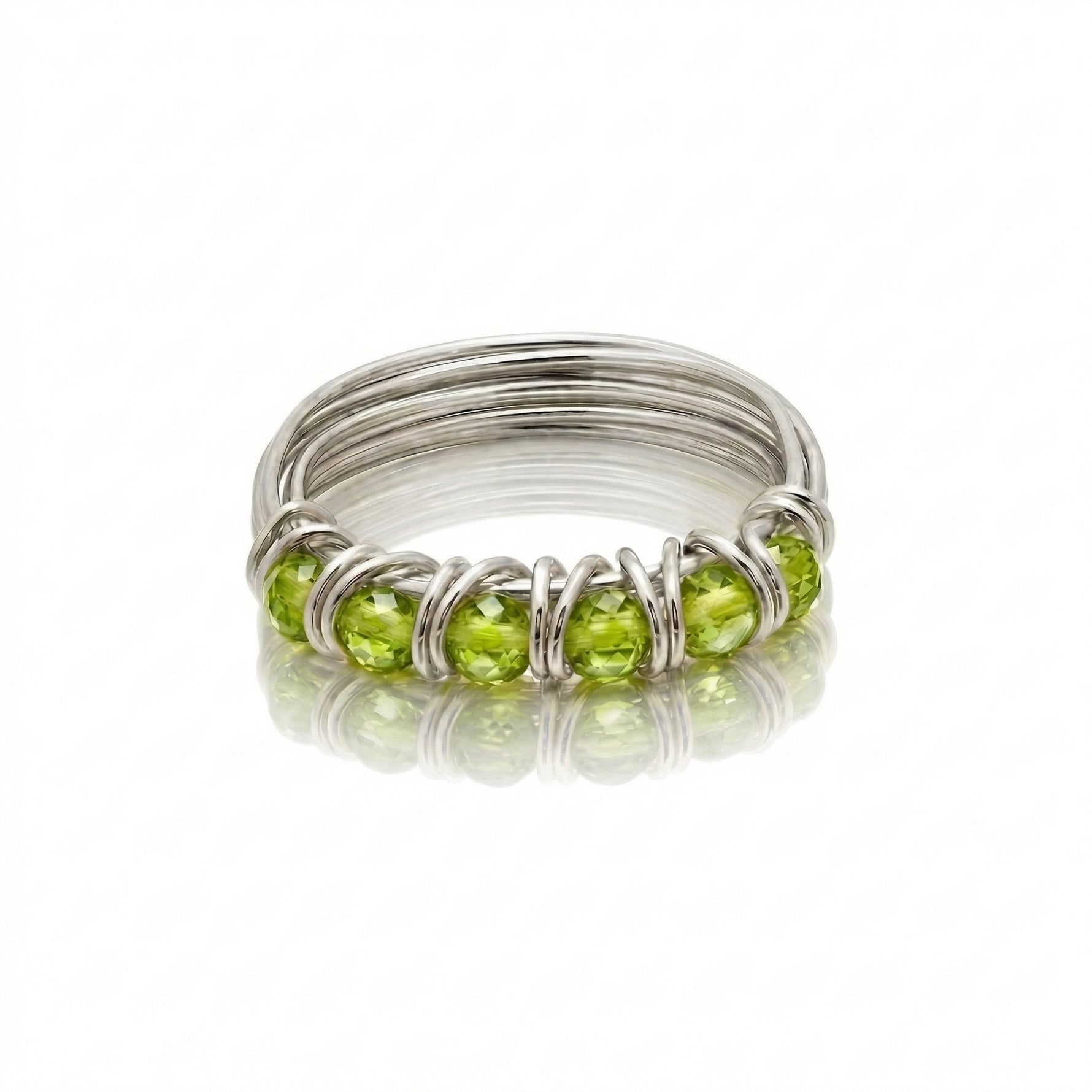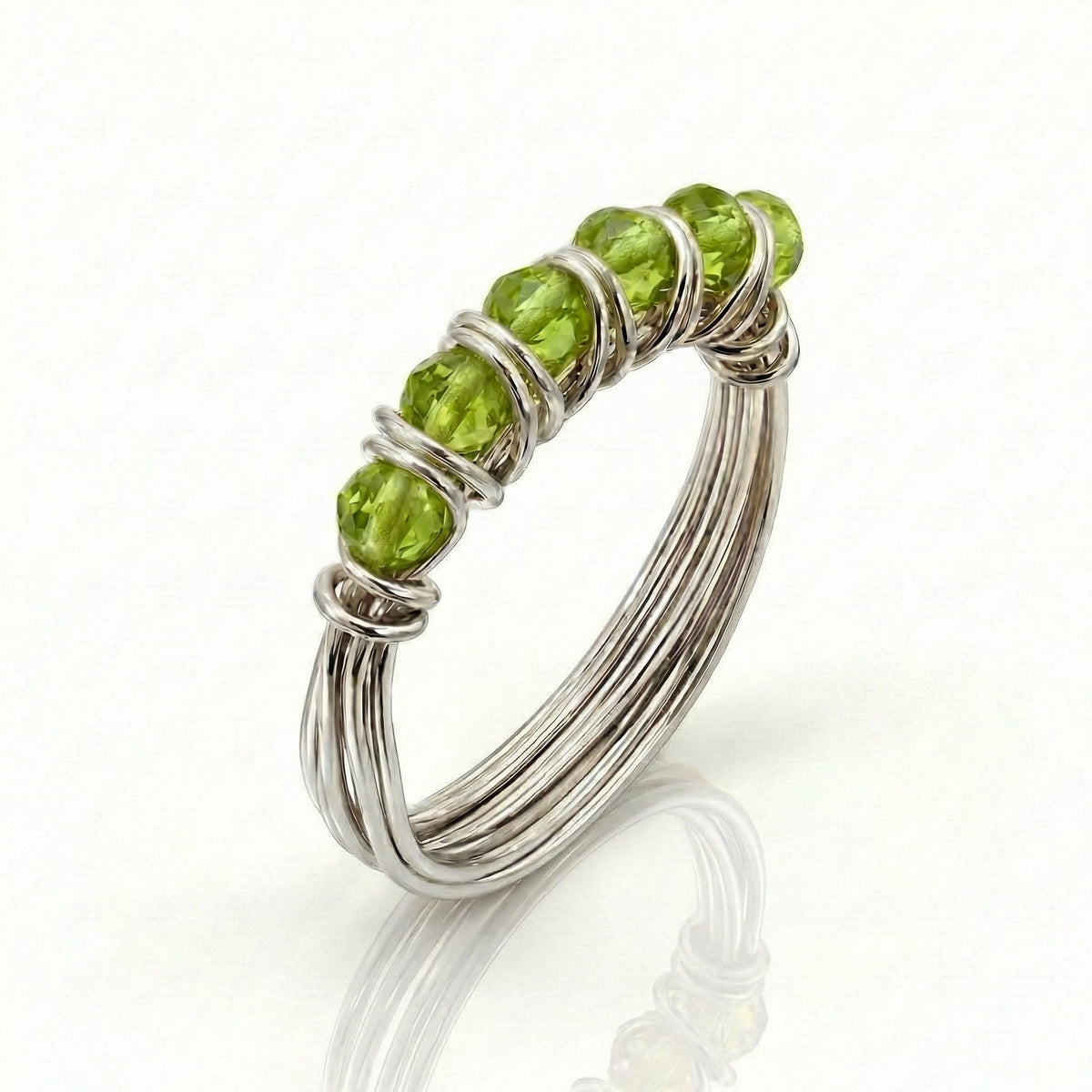 הטבעת מעוצבת בעבודת יד בטכניקת הליפוף המזוהה עם הסטודיו, המשלבת בין חוטי כסף טהור 999 לבין 6 חרוזי פרידוט טבעיים. הפרידוט נחשבת לאבן של התחדשות ושמחה, מה שהופך אותה לתוספת מושלמת לאוסף התכשיטים האישי שלך או כמתנה מרגשת בדרגת הטוהר הגבוהה ביותר.