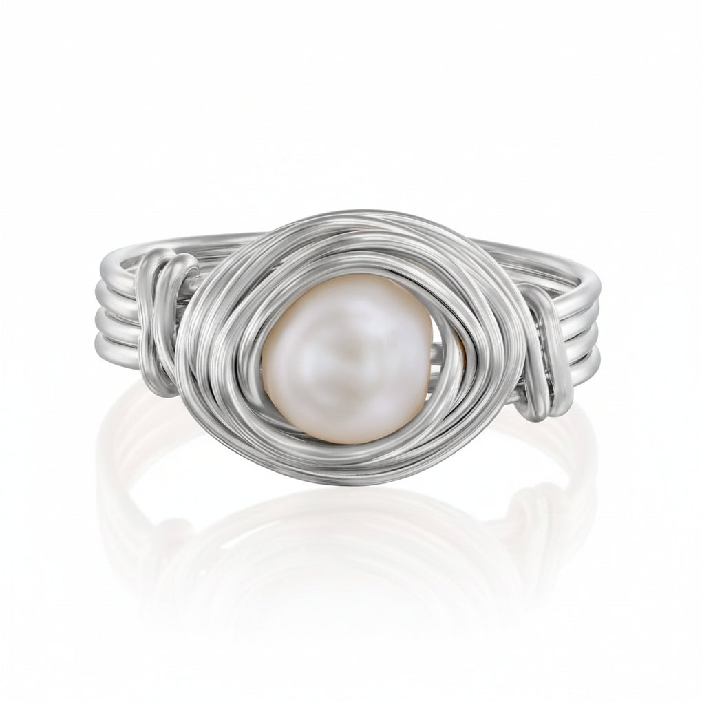 חמישה חוטי כסף טהור מתמזגים לבסיס רחב ונוח העוטף את הפנינה במרכז