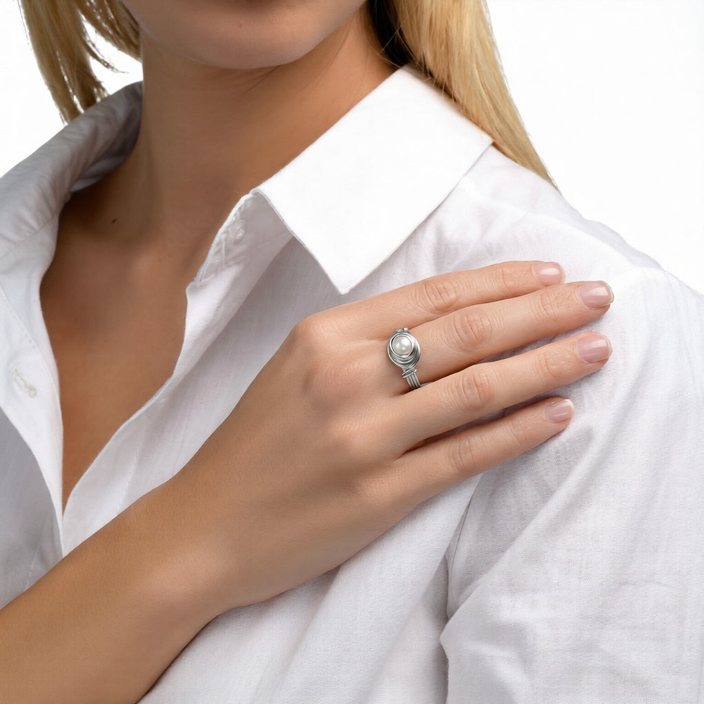 טבעת סימפלי כדור פנינה כסף – יוקרה קלאסית בעיצוב מודרני