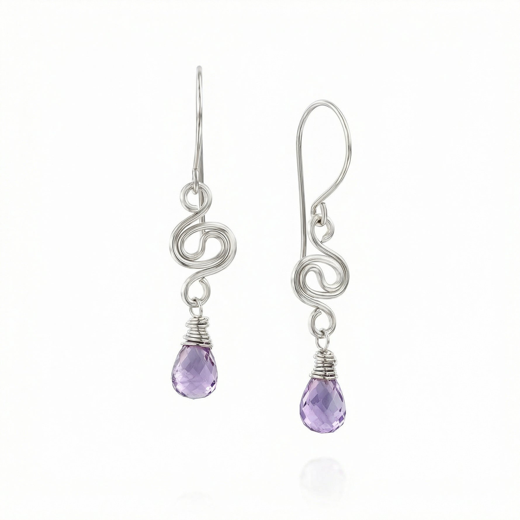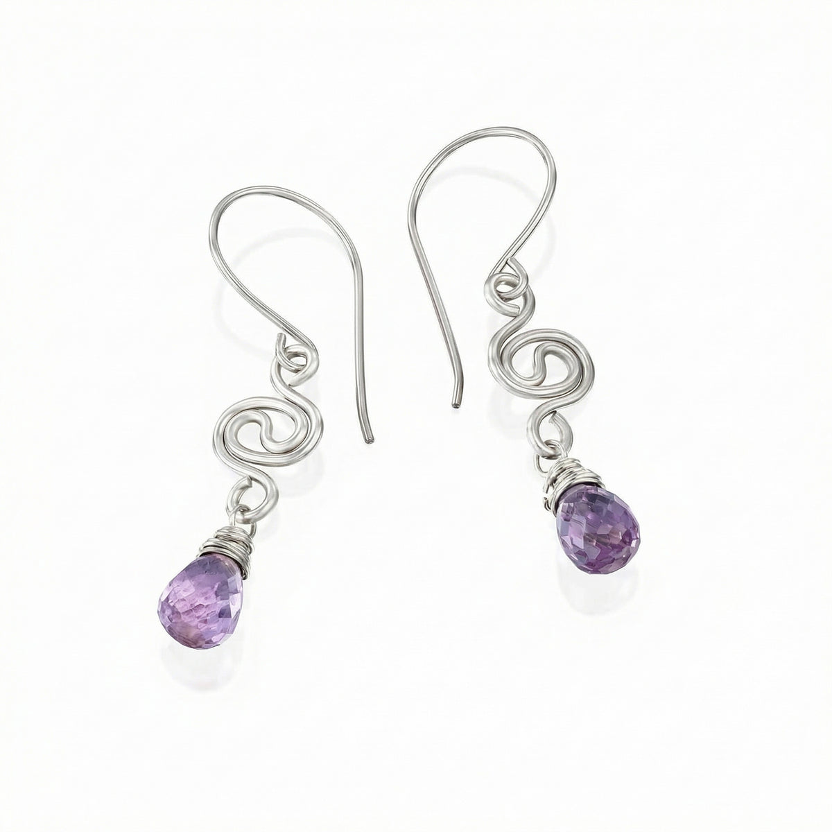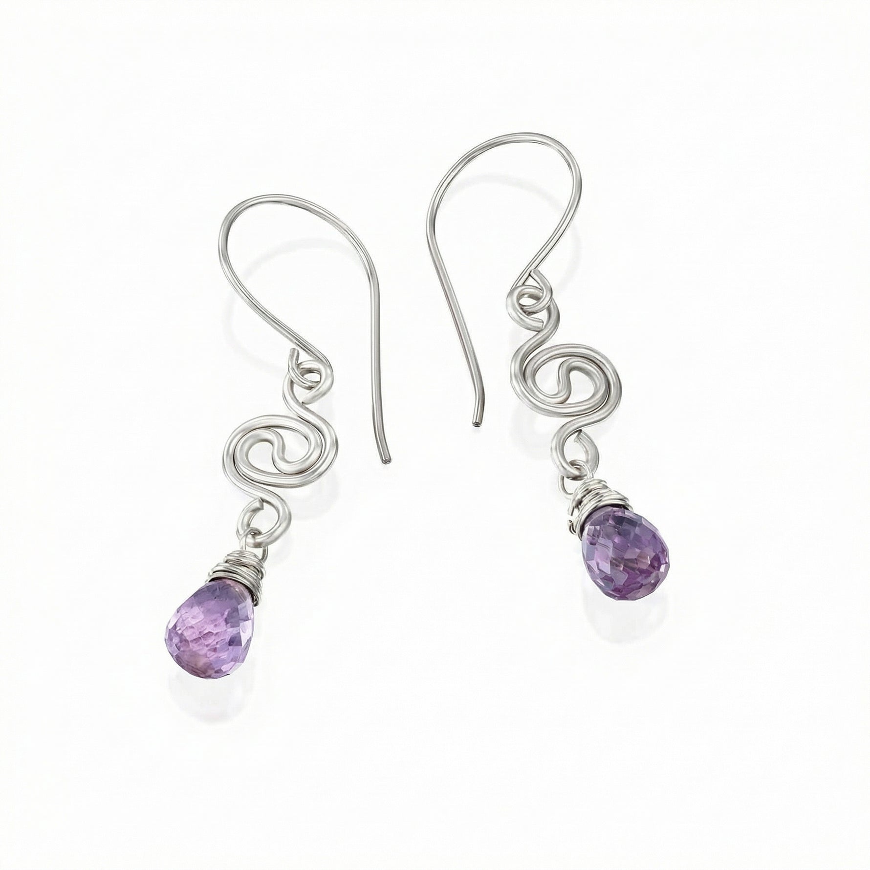 העגילים מעוצבים בטכניקת ליפוף ידנית וייחודית, כאשר חוטי הכסף טהור 999 יוצרים תנועה גלית ואומנותית המזכירה את זרימת המים או את קשת בענן (Rainbow). בקצה כל עגיל משובצת טיפת אמטיסט טבעית בחתך פאסט, המנצנצת למרחקים ולוכדת את האור בצורה מושלמת. האמטיסט ידועה כאבן של שלווה פנימית, איזון והגנה, מה שהופך אותה למתנה מושלמת עם משמעות עמוקה.