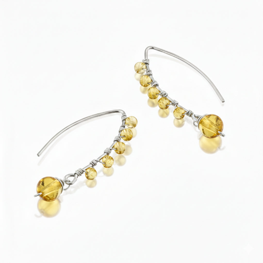העגילים מעוצבים במבנה מאורך ומחמיא, כאשר לאורך מתלה הכסף הטהור שזורות בעבודת יד מוקפדת אבני סיטרין קטנות המטפסות במעלה העגיל ויוצרות רצף של זהב טבעי וניצוץ. בתחתית כל עגיל תלויה אבן סיטרין גדולה ומרכזית, המעניקה לעגיל תנועה זורמת ונוכחות יוקרתית שמאירה את הפנים בכל תנועה של הראש.