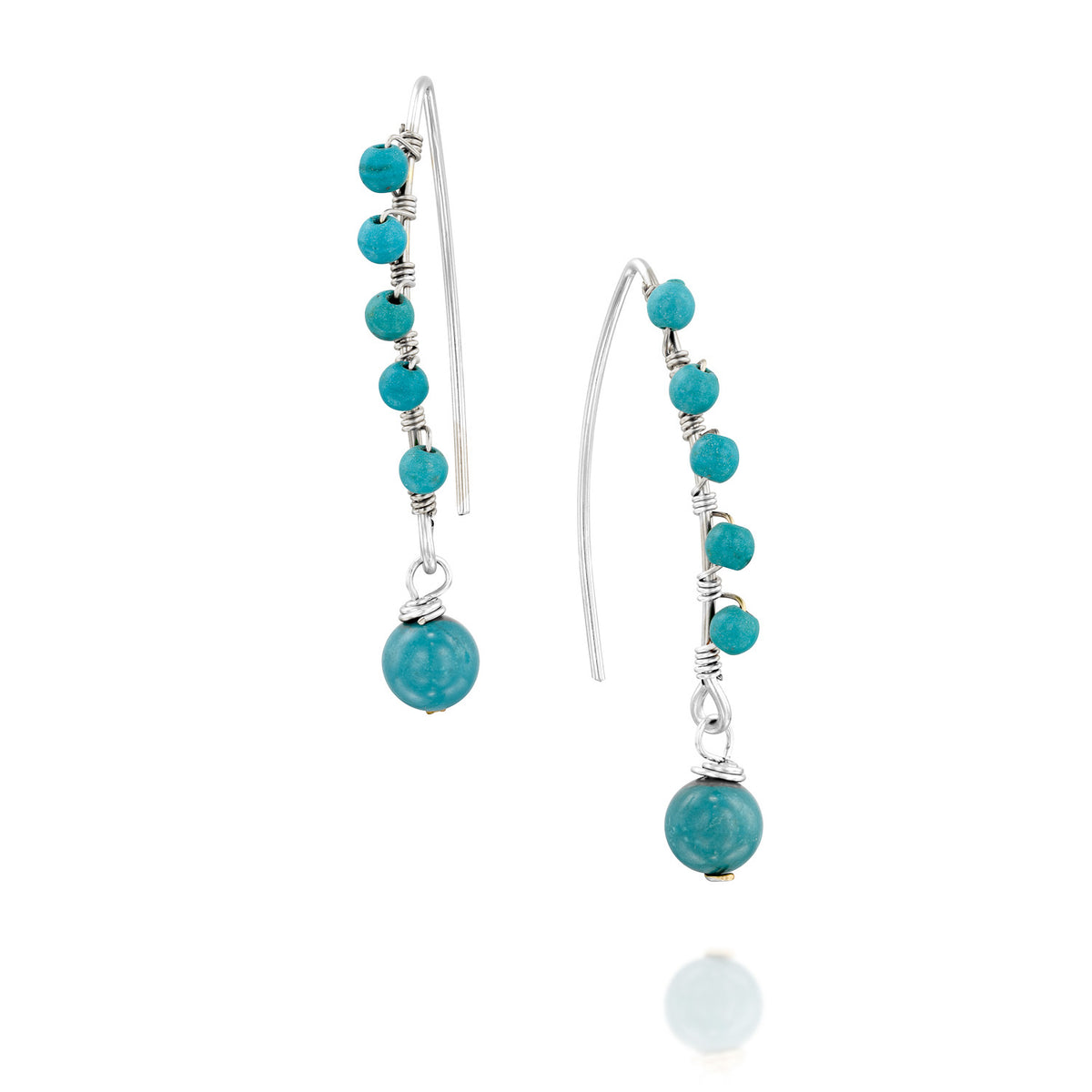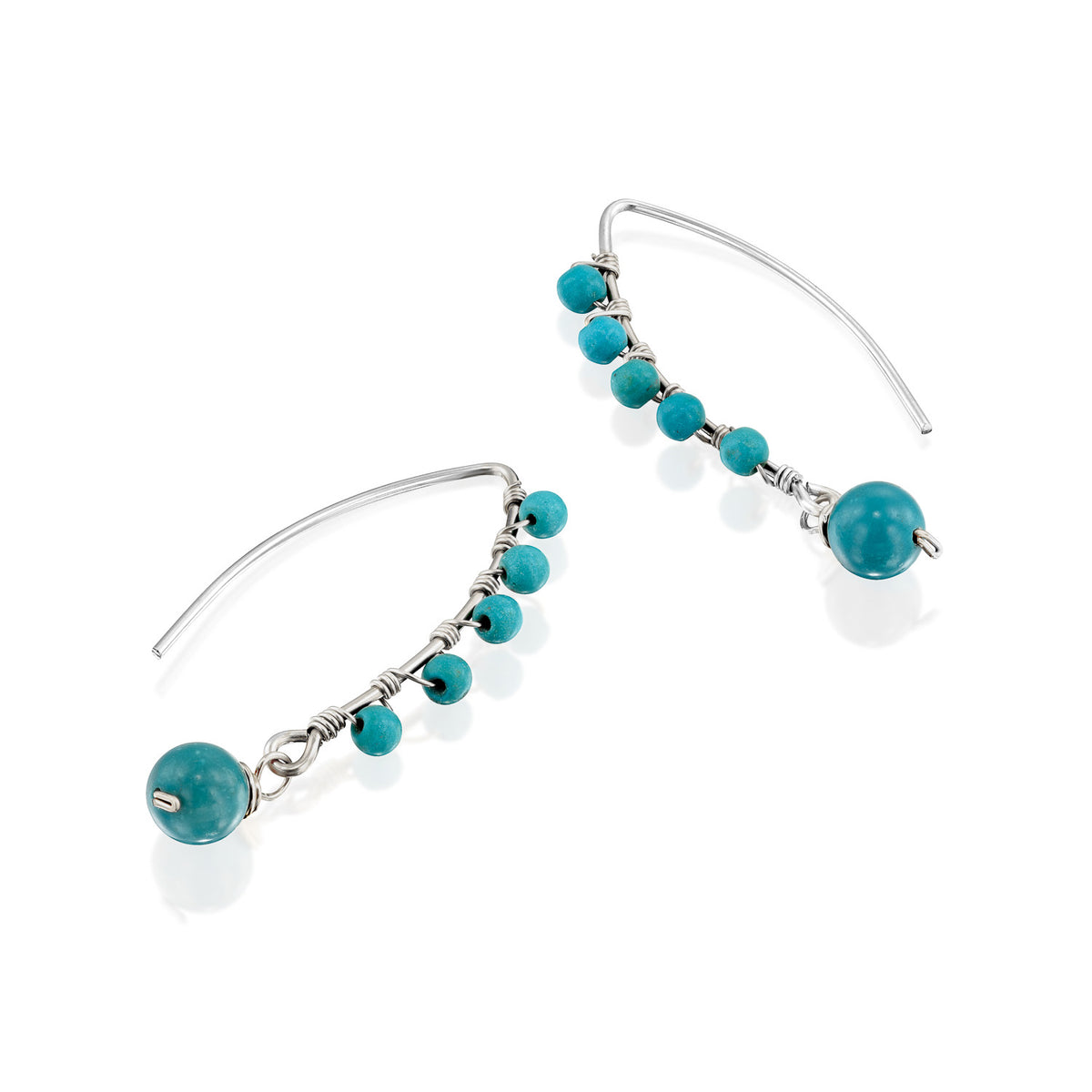 ​העגילים מעוצבים במבנה מאורך ומחמיא, כאשר לאורך מתלה הכסף הטהור שזורות בעבודת יד מוקפדת אבני טורקיז קטנות המטפסות במעלה העגיל ומעניקות זריקה של צבע רענן. בתחתית כל עגיל תלויה אבן טורקיז גדולה ומרכזית, המעניקה לעגיל תנועה זורמת וניצוץ ייחודי שמאיר את הפנים בכל תנועה של הראש.