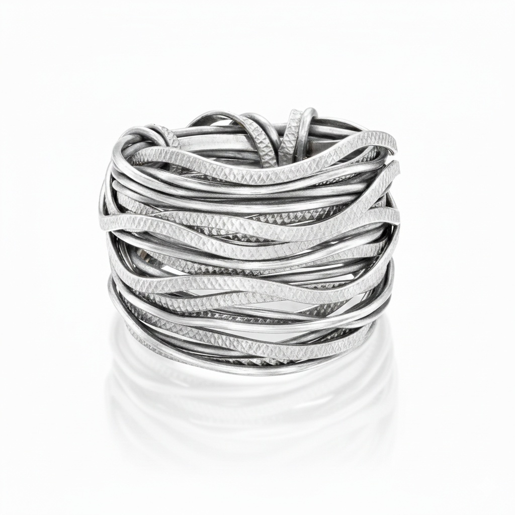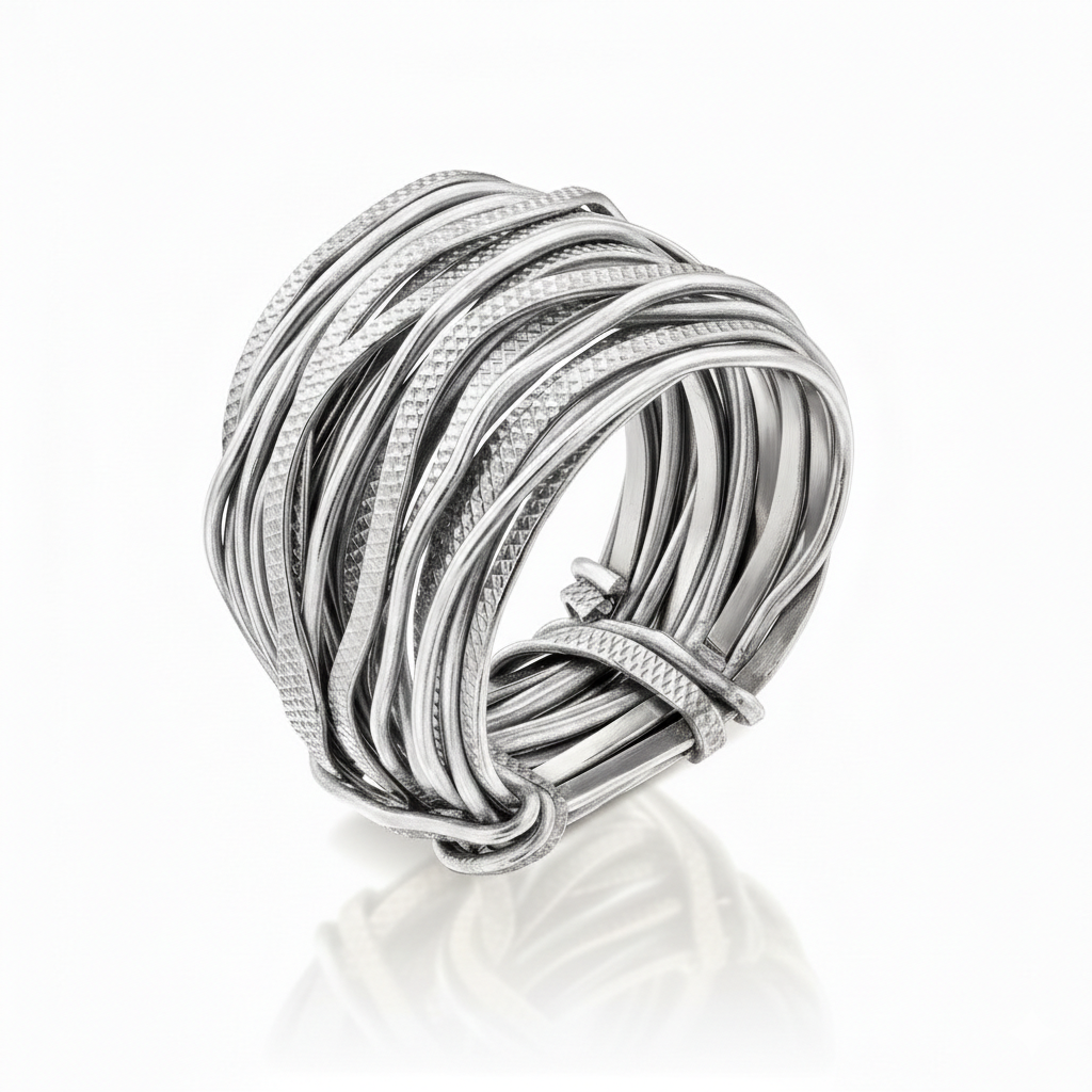 העיצוב הייחודי, המורכב משכבות של חוטי גולדפילד במבנה ספירלי עוטף, יוצר טקסטורה עשירה וגלית שתופסת את האור מכל זווית. ברוחב של 2 ס"מ, הטבעת מעניקה לכף היד מראה מוארך, נוכחות דרמטית וסטייל מובהק, תוך שמירה על נוחות מקסימלית.